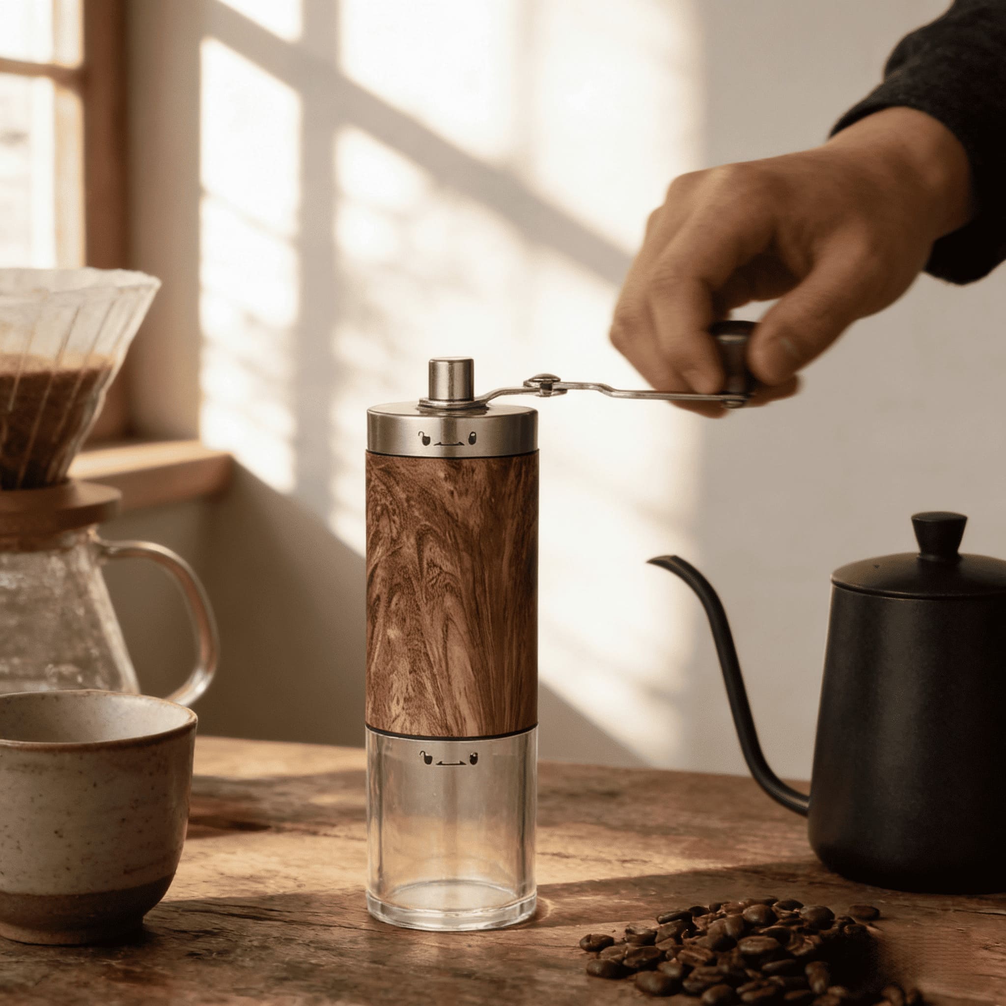 This manual coffee grinder combines timeless walnut wood aesthetics with precision engineering. Its stainless steel conical burr features 18 adjustable grind settings (from fine espresso to coarse cold brew), and the transparent powder chamber lets you check grind volume at a glance. The foldable crank ensures portability—no electricity needed—and it elevates pour-over, French press or AeroPress brews with fresh, aromatic grounds.